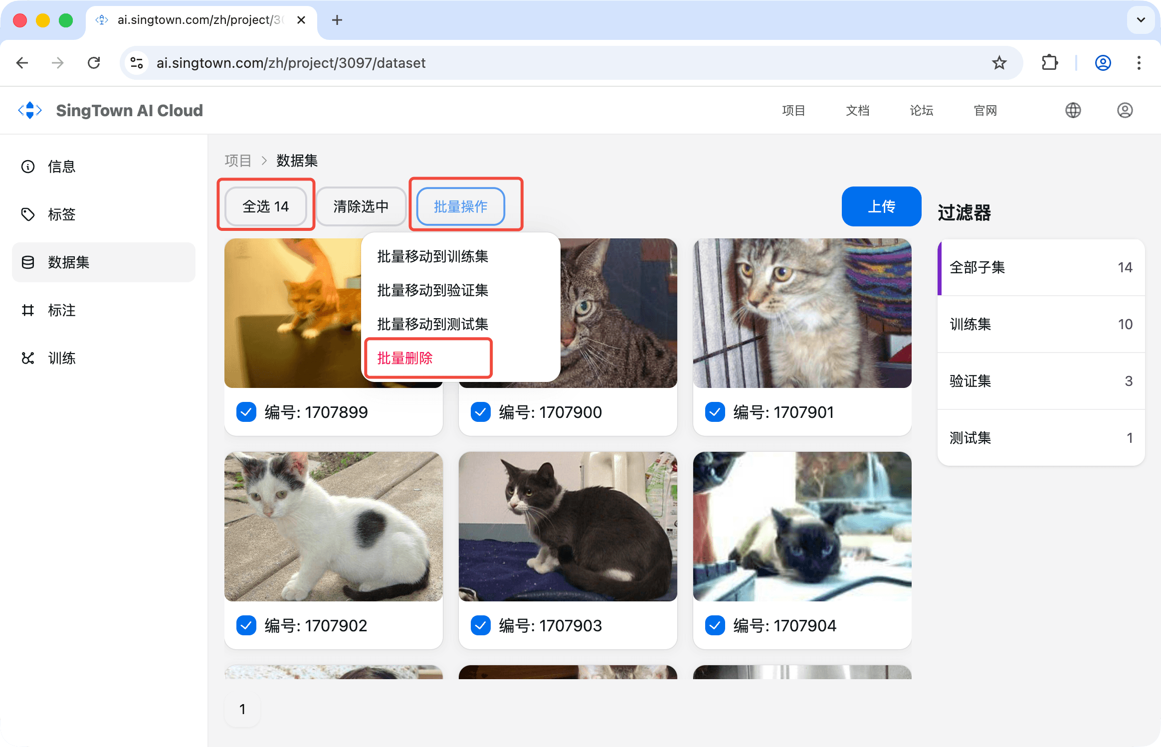 数据集是训练的材料,你可以将图片上传到数据集,然后标注图片。然后将数据集用于训练模型。