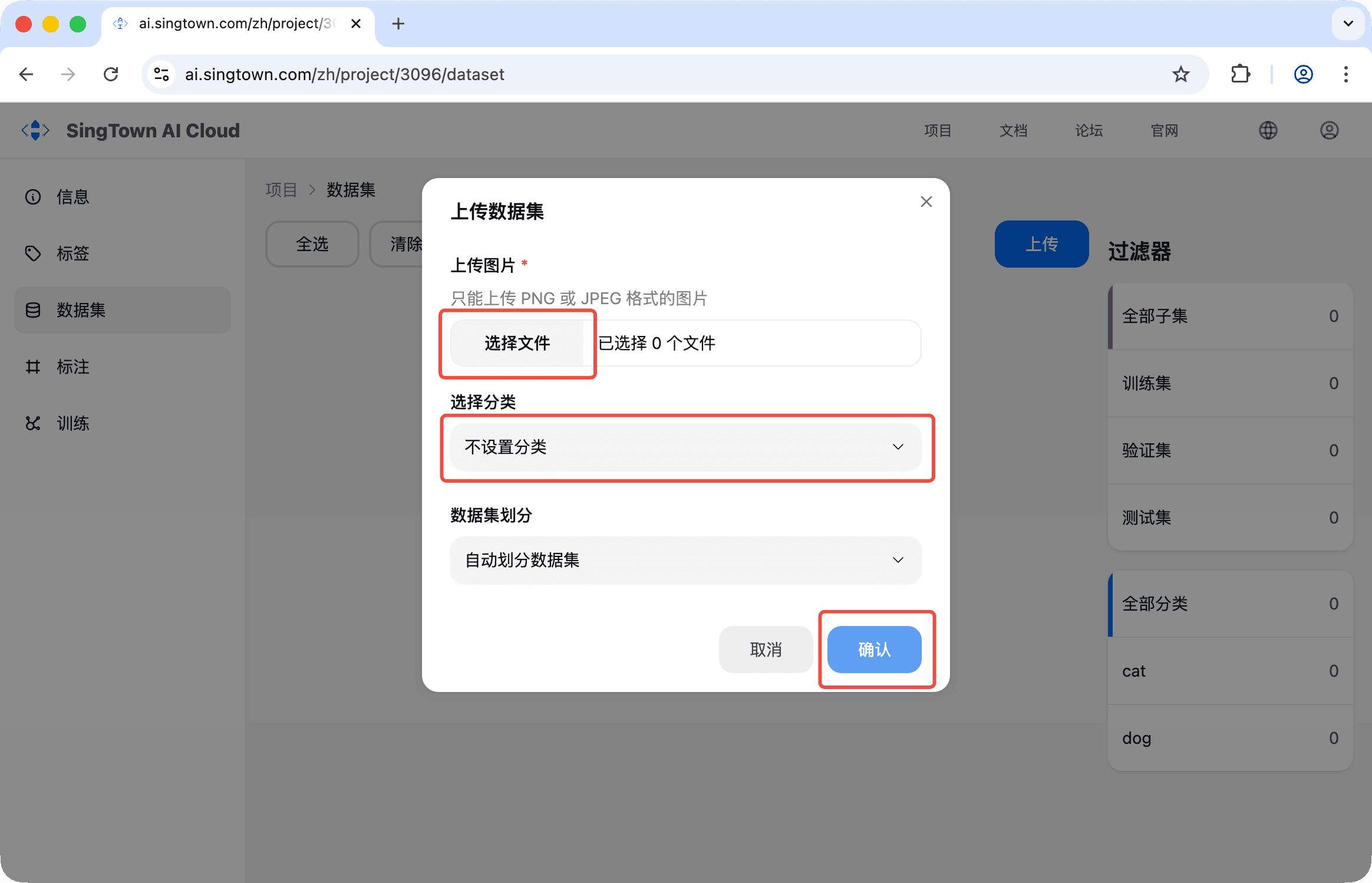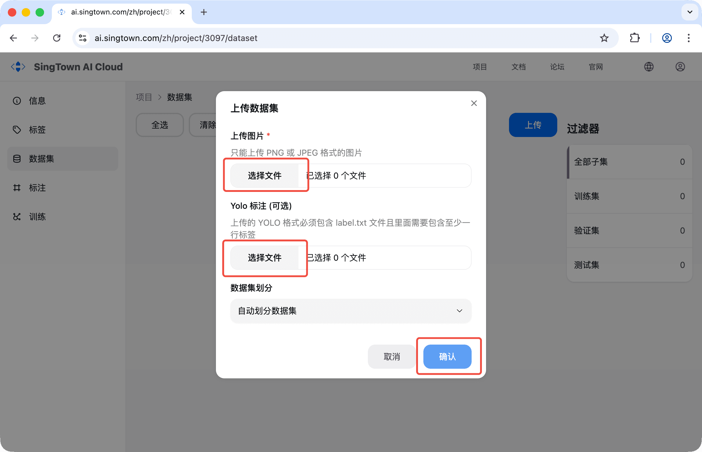 - 点击「选择文件」,选择图片和标注文件,点击确认即可