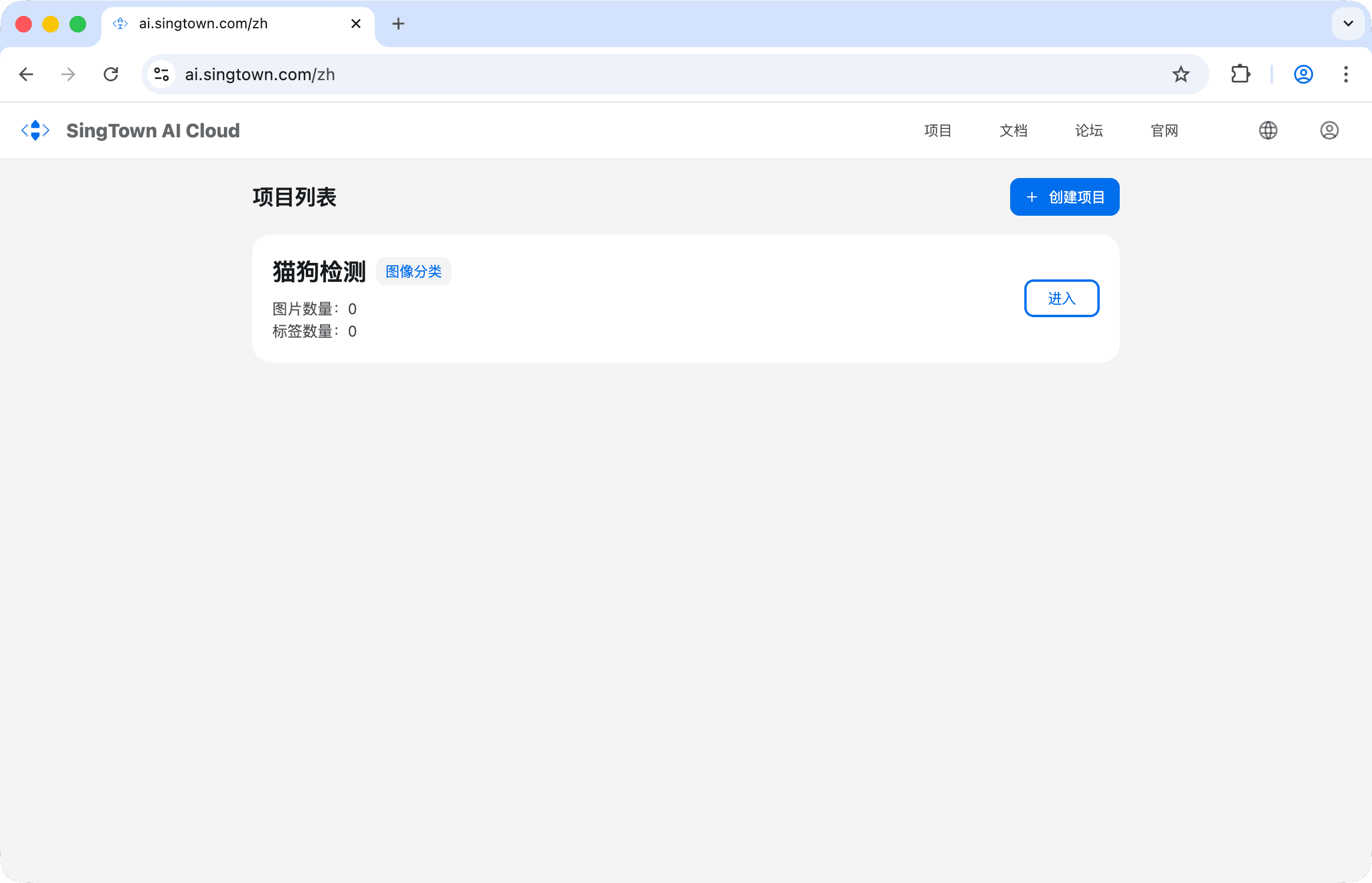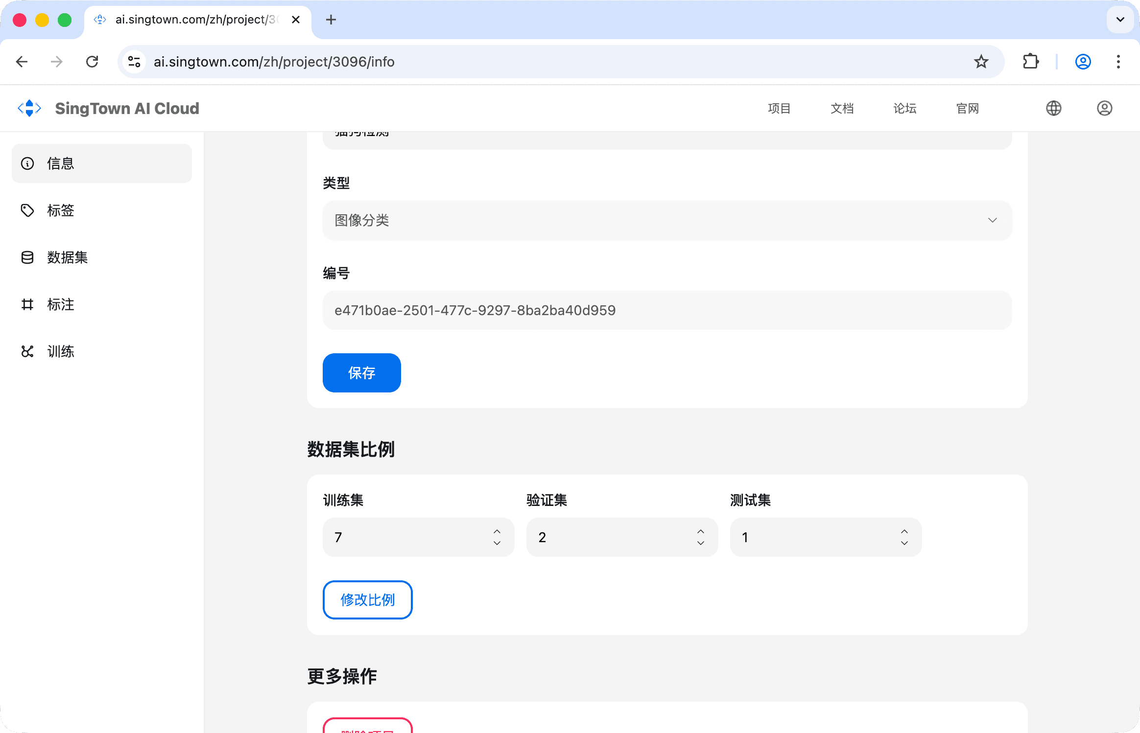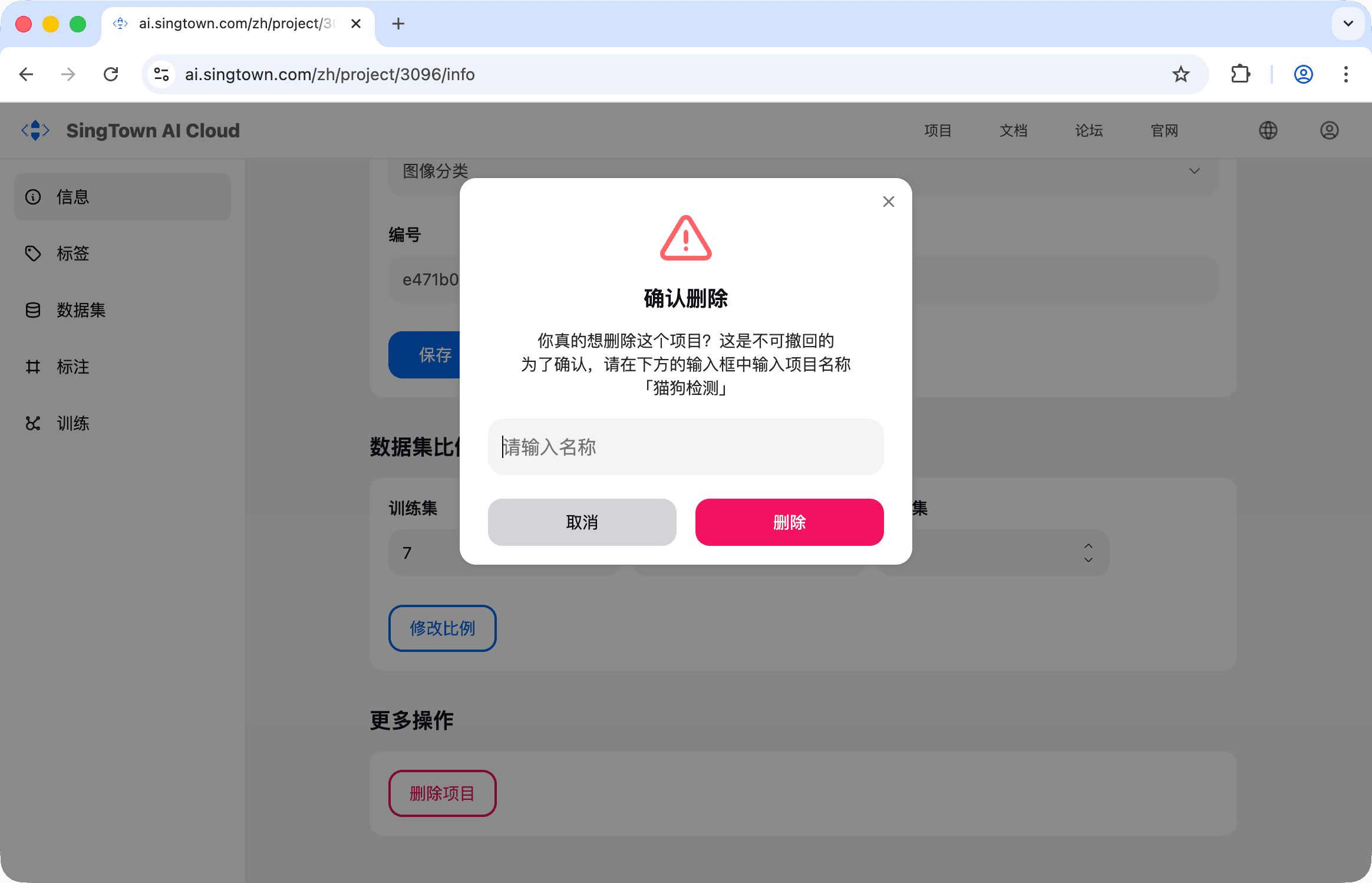 在线教程项目管理新建项目 在首页,点击 「创建项目」 按钮。 输入项目名称并选择对应的项目类型,再点击确认即可。 打开项目 点击对应的项目名即可打开项目。 修改项目信息 打开项目后,可修改名称、自动划分数据集的比例 删除项目 打开项目后,点击「更多操作 > 删除项目」,输入项目名称确认后即可删除项目。 账号管理Previous Page数据集管理Next Page